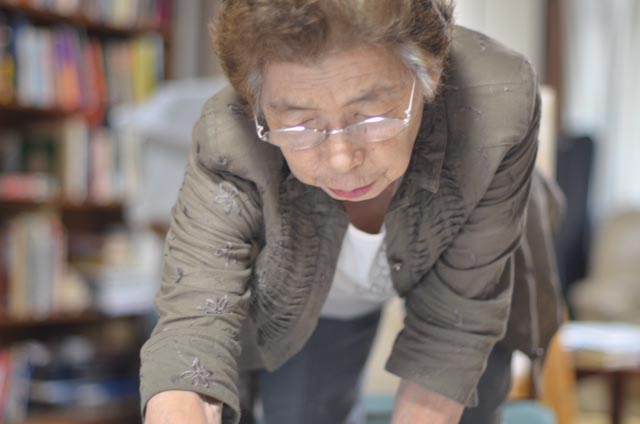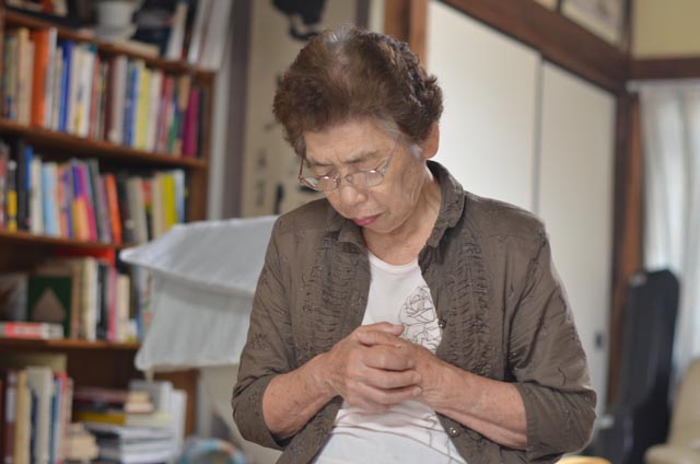Kasaoka was 12 years old when the Atomic Bomb hit Hiroshima. Kasaoka had the day off because she was in between wartime work assignments. One of several children but the only one still living at home, Kasaoka was standing at the window when the flash occurred. “It was a beautiful color. Orange like the sunrise.” The impact shattered the glass and threw her back several feet. Then it was dark. She suspects that she lost consciousness.