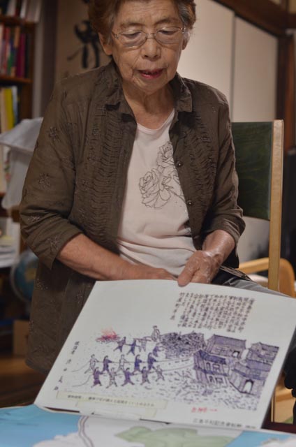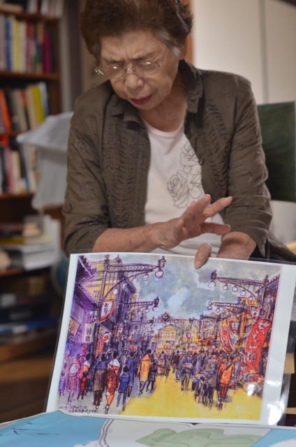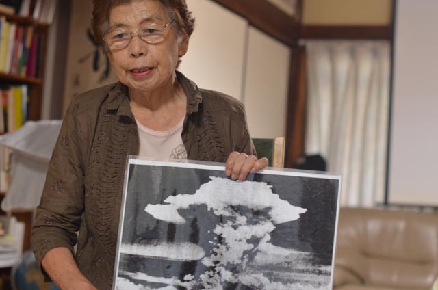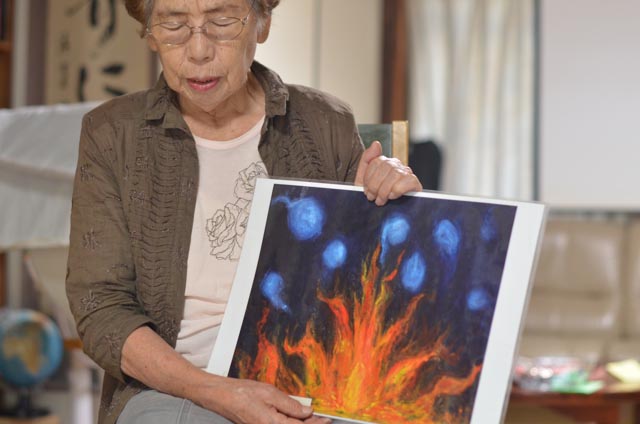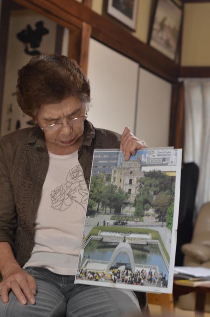 As she spoke, Kasaoka showed us artwork. One piece she had created as a young girl in elementary school showing images of pre-war Hiroshima. It looked charming with lanterns and shingled homes. As the story progressed, she showed images of victims both in photograph and in abstract art. One reflected her father’s charred back which she treated with ointments for two days before he died. Another reflected the loss of her mother and the regret that she and her mother had argued that morning.