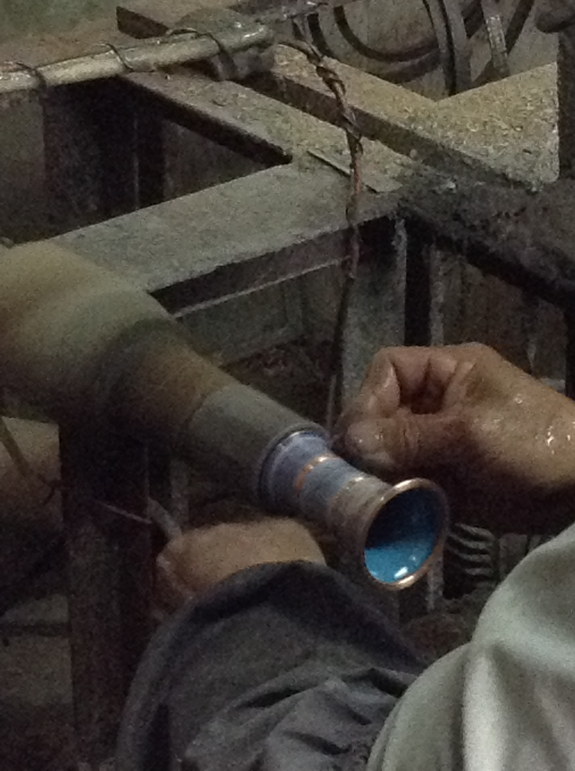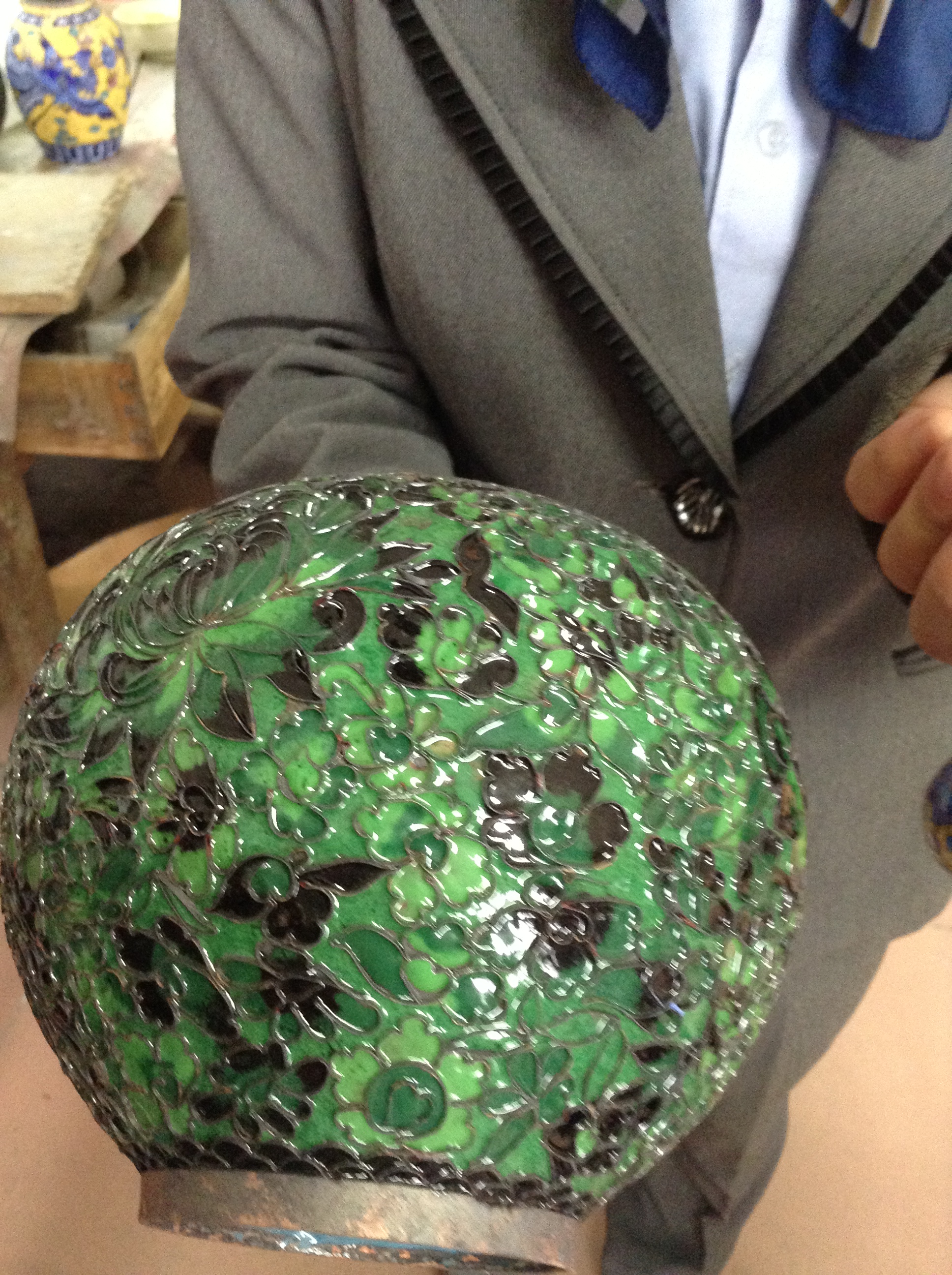 We stopped at a cloisonné factory to kill time on the way to the airport. It turned out to be a nice little stop. The factory manager showed us the process for making cloisonné (pound and solder pieces together, hand lay the wire, drop paint and glaze into the designs, fire at 1000 degrees, fix any discoloration, fire again and again, polish twice, overlay the gold leafing (top secret so won’t show that step) and voila! your bowl, vase or bracelet is finished.