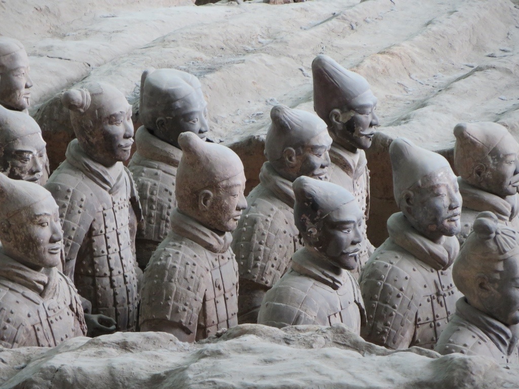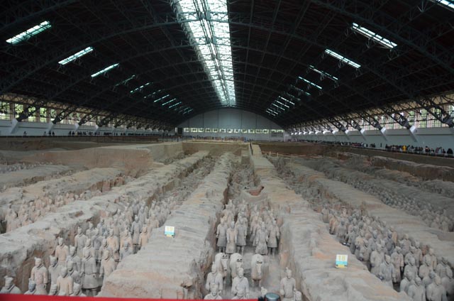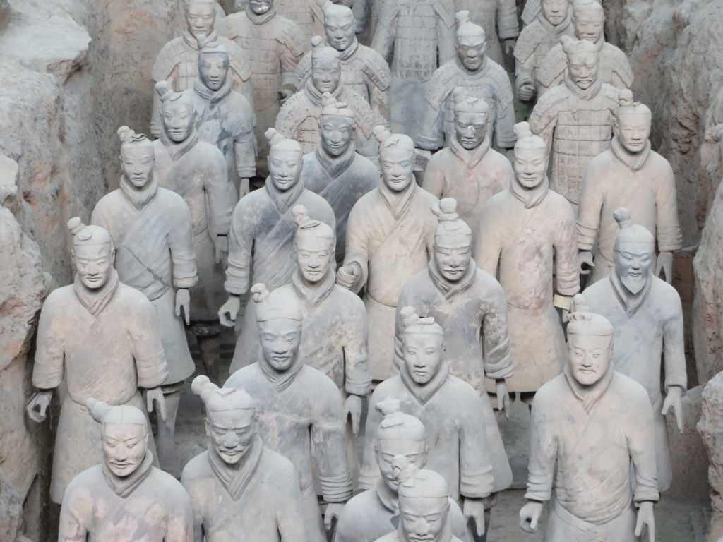 Emperor Qinshi Huangdi was the first emperor to rule a unified China – I should say that differently. He unified China under one ruler consolidating the various kingdoms by overtaking them militarily. He is said to have been a brutal ruler. In any case, he presided over a unified China. Once unification was achieved he set about connecting the various ramparts into The Great Wall and building his tomb. Seven hundred twenty thousand men spent 38 years building his tomb and then filling it with soldiers, weapons, food, concubines and treasures to accompany the emperor on his death to the afterlife. After the Emperor died, there was a peasant uprising and the peasants raided the tomb. They took the weapons as arms and smashed and burned the remaining contents. Of the thousands of soldiers unearthed so far, only one has been found in tact. An archer. I found his expression quite peaceful and his is the close up that you will see below.