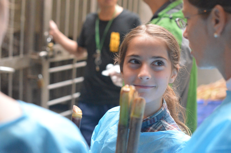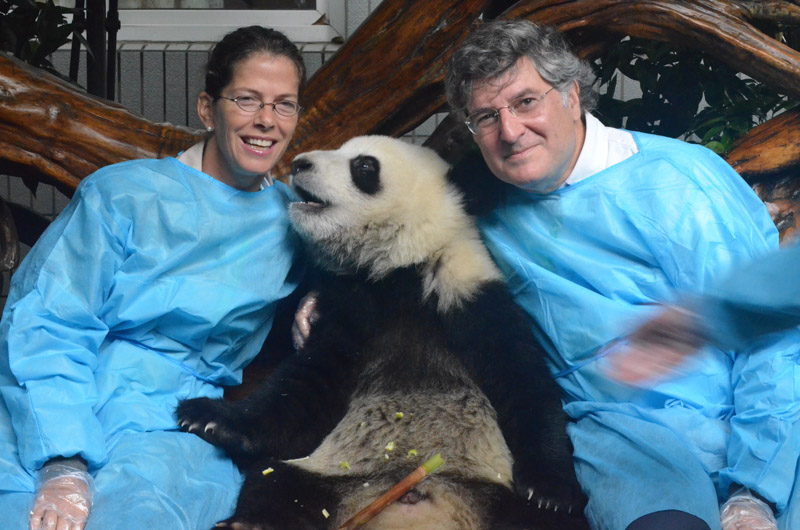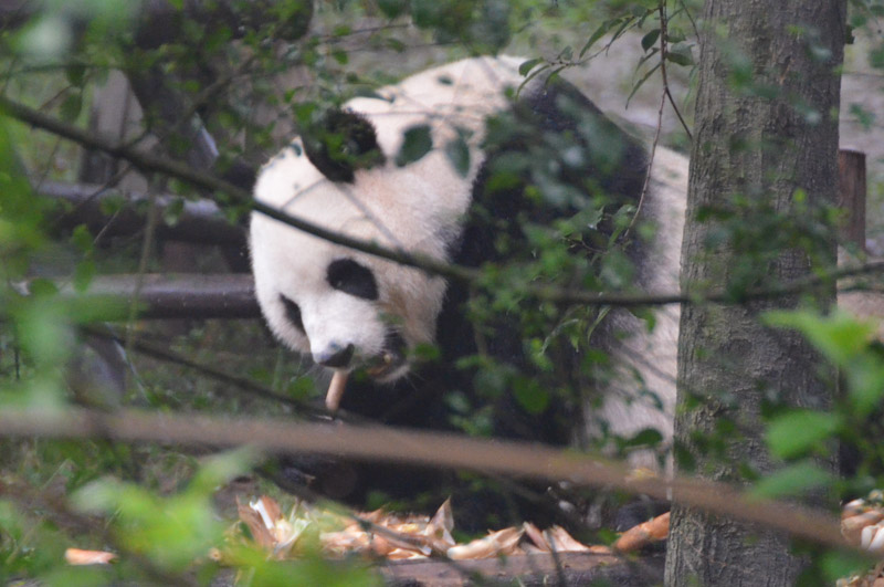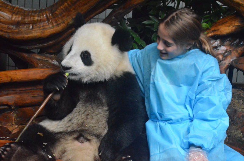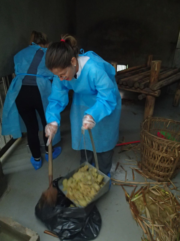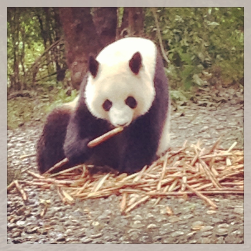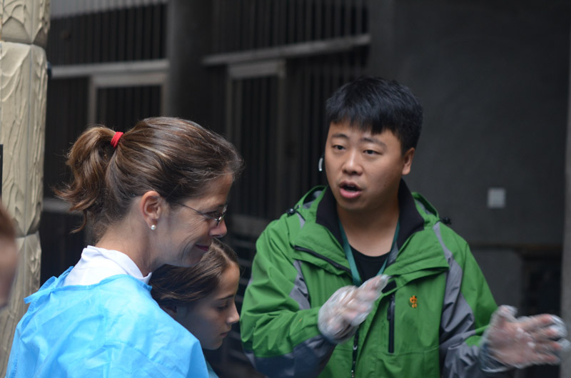 Volunteering was the best part of the experience. We learned about the Center’s breeding program and the effort to reintroduce the panda into the wild. We spent an hour helping four male pandas do their morning exercises. Each morning the panda keepers help the pandas strengthen their hind legs by raising and lowering an apple, basically making them do squats. We were taught how to lead the exercises and we took turns exercising four of the male pandas. Once the exercises were completed, we fed them a morning snack of bamboo shoots, released them to their outdoor play areas, and then cleaned out the emptied cages. In one cage, 17.5kg of panda poop for FuFu, or “abundance” in Mandarin. Based on his particular stats, 17-18 kg per morning cleaning is normal. Pandas eat roughly 40kg of bamboo shoots each day and “retain” only 45-50%. The poop is very fibrous and doesn’t smell at all.