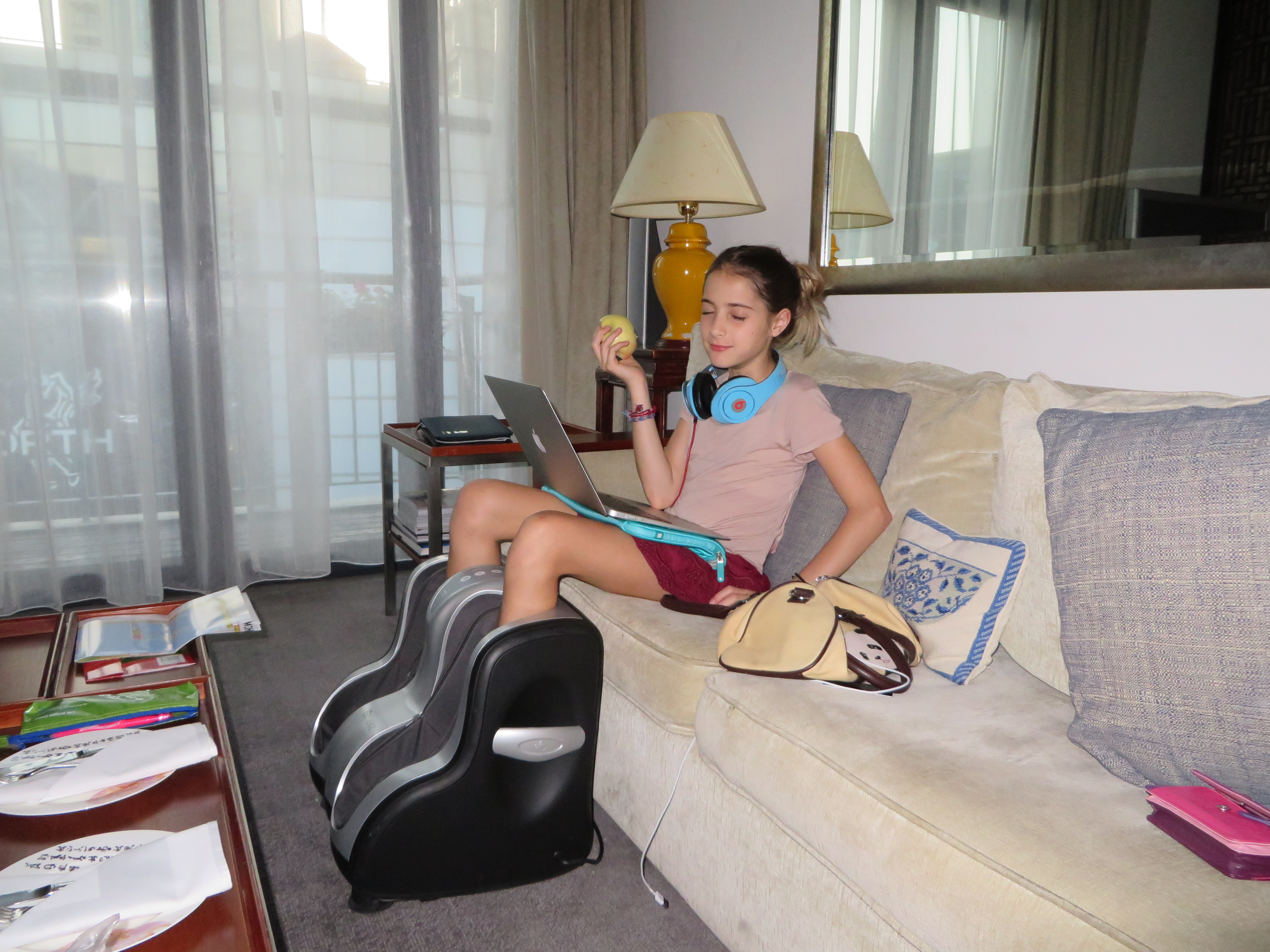 Another feature of the hotel/apartment was the iSqueeze. We first encountered his little contraption at Yodobashi. The iSqueeze is a foot and calf massager and it was how the girls and I began and ended our day. Andy called it the foot crusher and couldn’t understand why anyone would submit willingly to this kind of torture. But for me, a cup of tea, Words With Friends, and a foot crushing was a perfect way to start and end the day! Once the weather turned rainy (two typhoons passing nearby) the girls spent all day trading places from bed to iSqueeze.