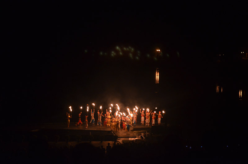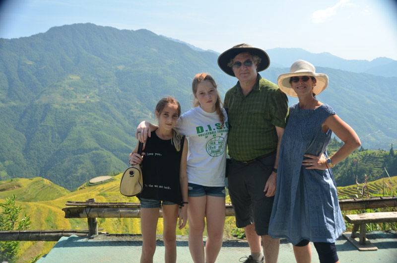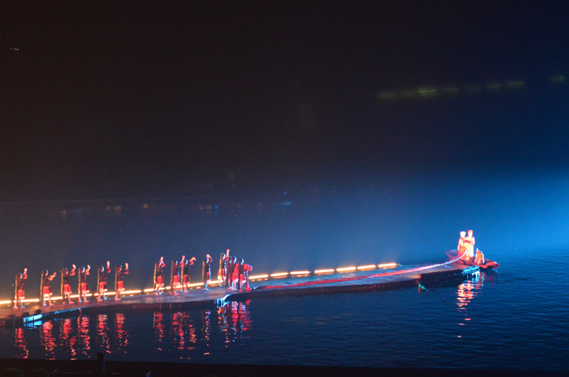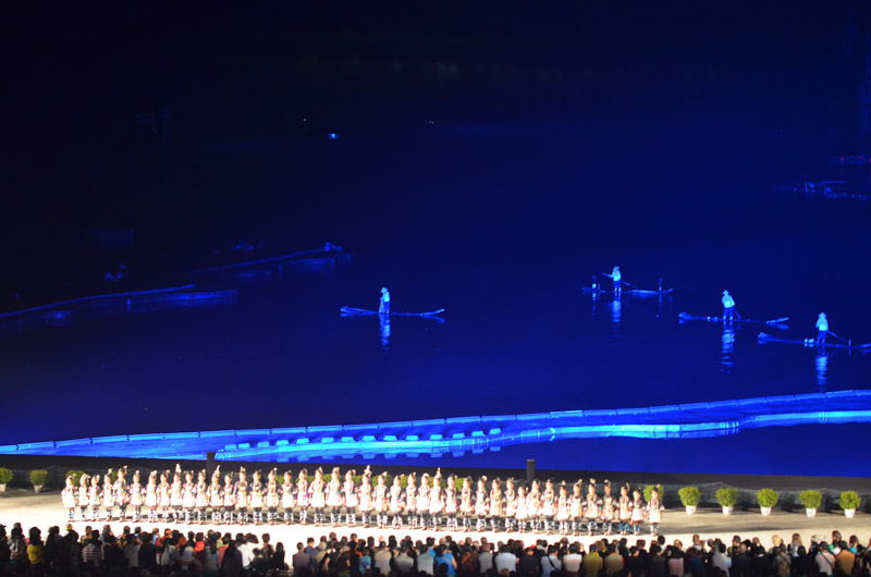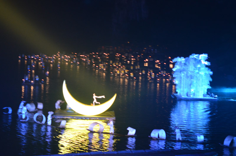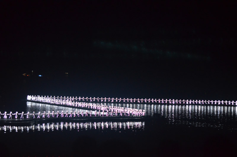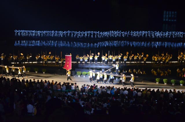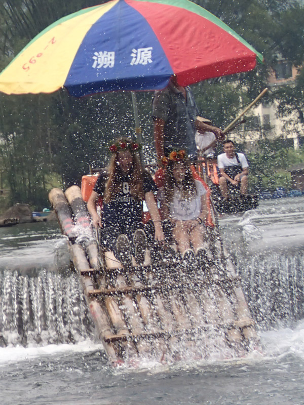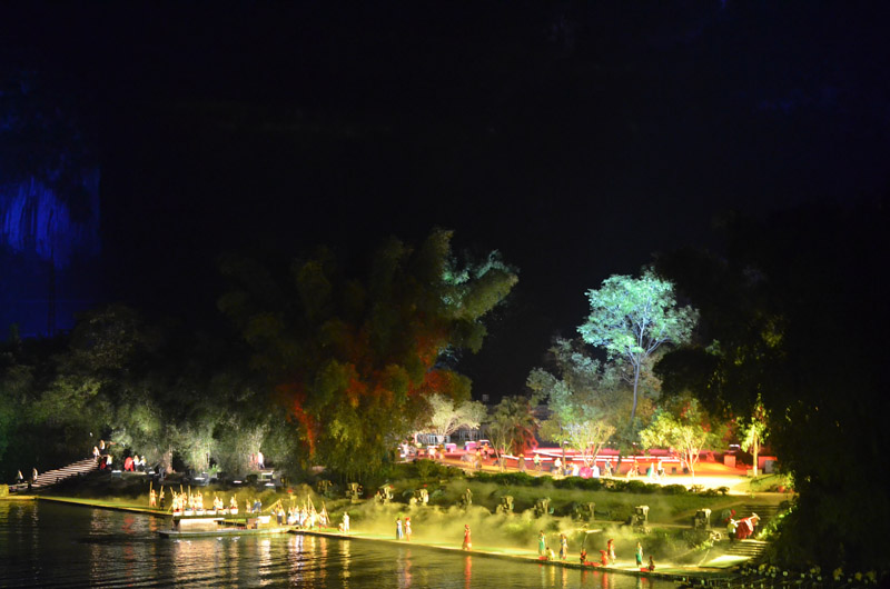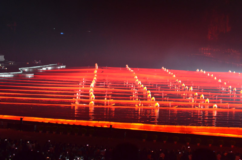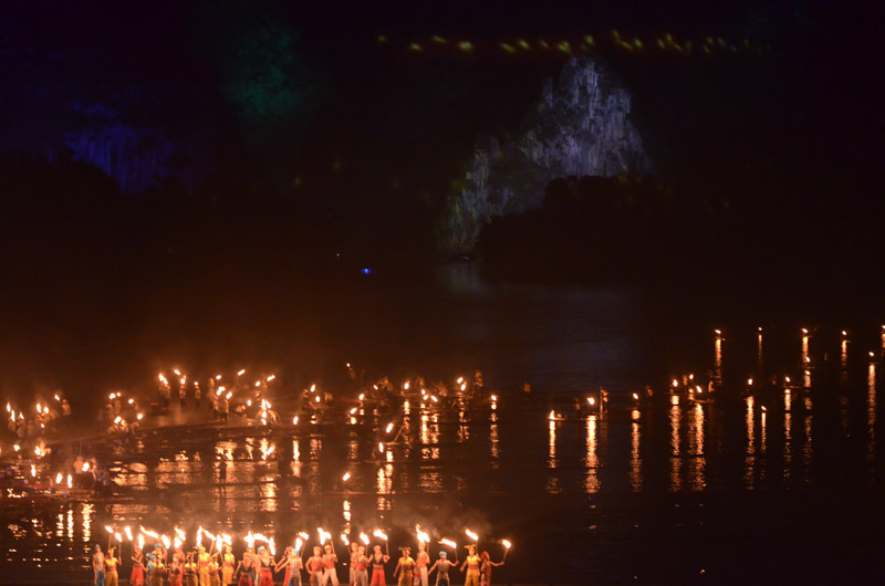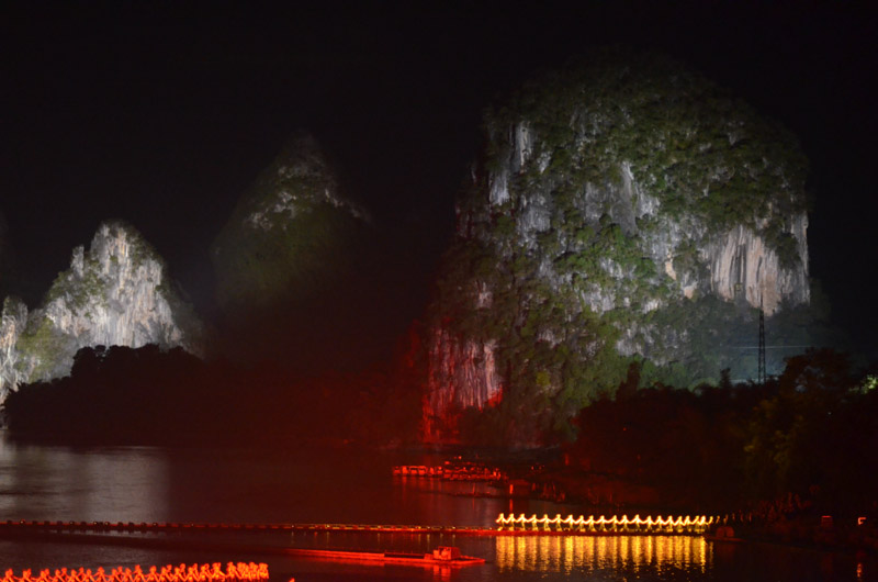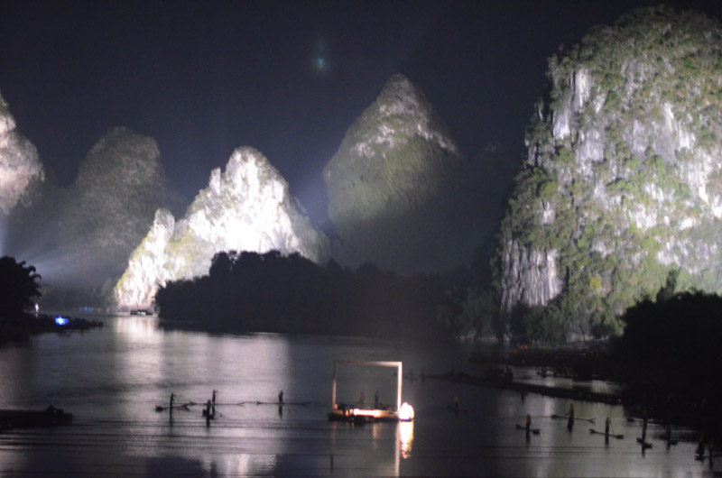 Our first day we drove to the top of a series of rice terraces in Longsheng. The people here have been farming these terraces for more than 1000 years. Next we boarded a boat (along with dozens of other tourists) heading down the Li River. Andy got a kick out of watching the parade of boats and their tourists photographing everything. We met a nice couple from Boston who have traveled extensively so we enjoyed the scene together as we made our way to Fuli. After lunch, we took a bike ride through farming villages and then drove to Yangshou. Yangshou is a resort town and people from all over southern China were coming here to holiday, making West Street a throng of people. The best thing about Yanshou for us was a show staged by Sanjie Lu the Director of the Beijing Olympics Opening Ceremony called “Impressions”. It was the telling of a love story and featured a stunning set design – its stage set within the Li River and the karst mountains lit behind – and a perfectly choreographed and synchronized cast of 400 actors.