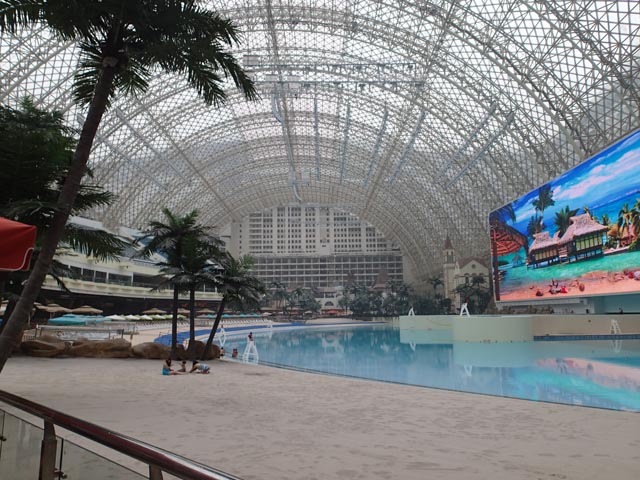 They say you can see the Great Wall from Space, and I don’t know that that’s true either, but it is more likely you can see the new Global Center Mall in Cheng du, supposedly the largest in the world. Inside the mall, in addition to retail space, restaurants, an IMAX movie theatre, and an ice rink, there are also multiple hotels and a super-sized water park. Yes, a water park. Complete with multi-story water slides and a beach with man-made waves. The New China.