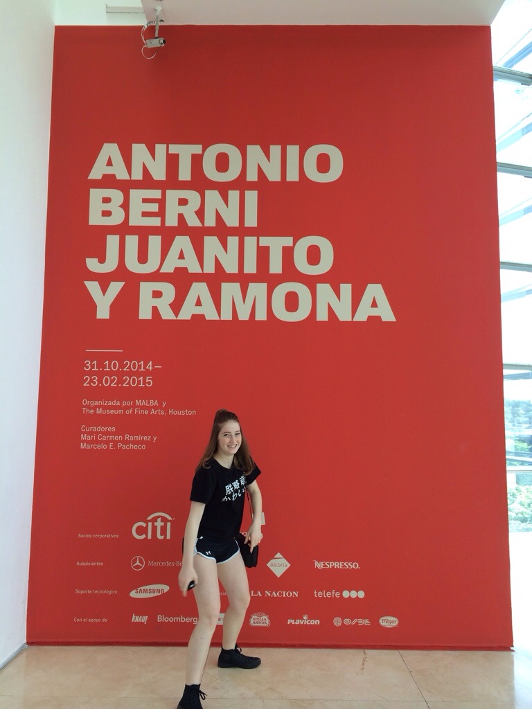On Monday we saw an exhibition at MALBA on the Argentinian artist Berni.  Berni’s early period included work on Mexican murals with Sequieros (sp?) which later tied in to the street art tour we took.  Berni is known for New Realism and his xylo-block print work.  Imagine a block print that leaves behind three-dimensional prints (bas relief block printing).  These photos are inadequate and perhaps their inadequacy will inspire you to look for better images elsewhere.  Juanito, a boy from the slums, and Ramona, an exploited girl, are examples of this New Realism and the way I understood it, Berni took realism and added to it items that these characters might find in their daily lives and placed them into the artwork —  nails, steel wool, bottle caps, fragments of lace. So not just a painting of people whose cheeks are hollow and their skeletons wasting, but the remnants of the work they might have done that day, bottling, building,  selling themselves.  I may not have this right so please, Lisa P or Leonard R or Marsha LT, correct me.