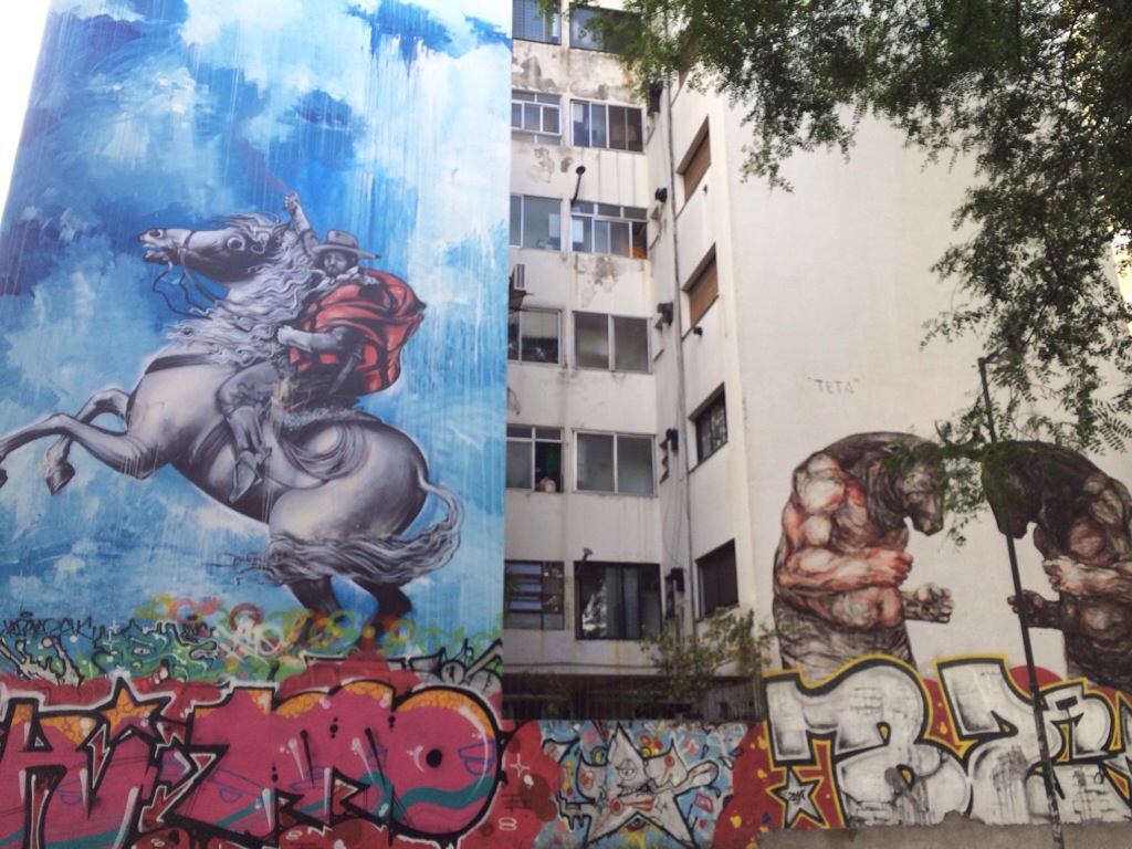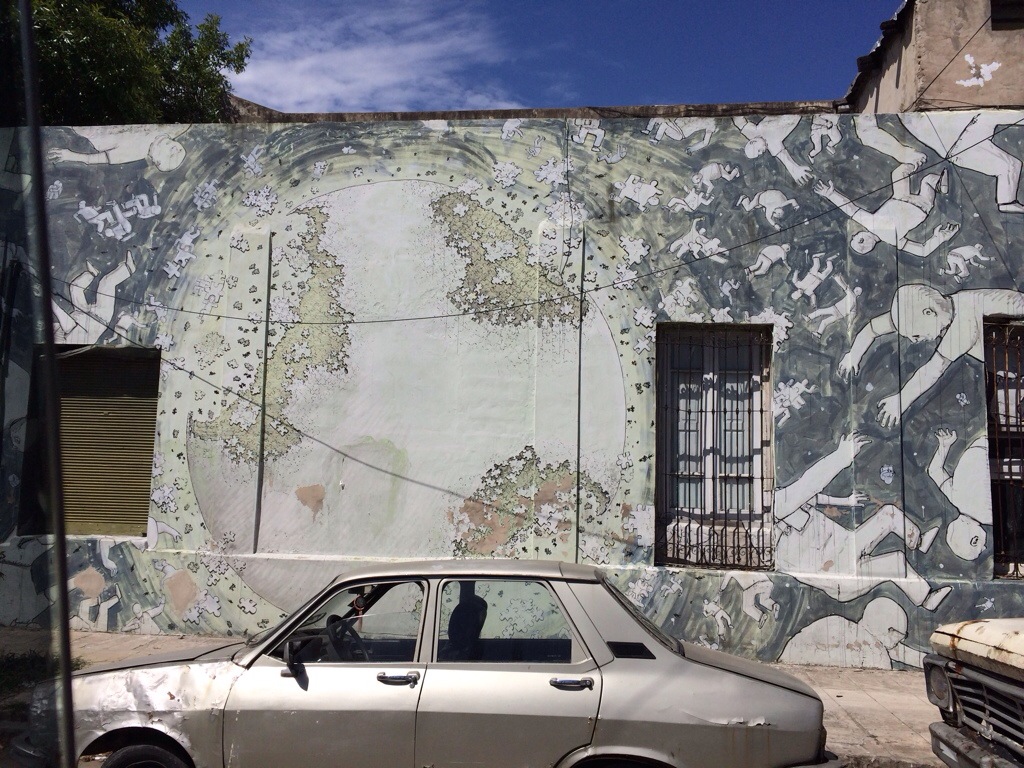 After MALBA, we took GraffitiMundo’s street art tour (thank you Rob for recommending it). We’ve now seen street art in several cities – Melbourne, Paris, Brussels, Berlin, London, Buenos Aires.  I like different aspects from each city. In Melbourne, a playful sensibility. In Paris, small discrete characters like space invader and the stop sign guy.  In Berlin, I liked the political messaging and the city’s embrace of street art as an important art form.  In BsAs, I like the scale of the work and the fact that the street art movement includes artists from all economic classes:  architects, graphic artists, illustrators, set designers, etc.  As our guide explained, these are people who have comfortable lives and yet they risk it to bring art to the general public. (Of course, how illegal can it really be if the politicians commission their own artists to paint their names along walls in their party’s colors.  And by “party” one could easily relate party to which soccer team one favors.)