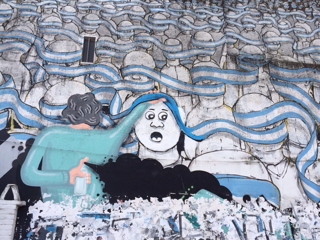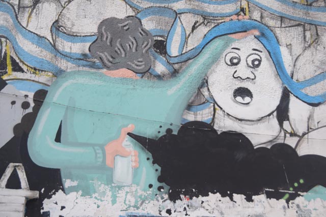 These are the largest format murals we’ve seen and they often honor the father of public art here, Benito Quinquela Martin. Sometimes they tell the story of Argentina’s disappeared (thousands of people presumed murdered by prior regimes) or poke at political issues. The largest ones here are by Pastel, Mart and Jaz and BLU.