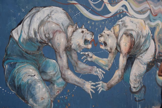 Getting to know the artists and their work, one gets to know more about the culture and ethos of a place. Blu’s grandfather lived here in Argentina during the time that workers were organizing and unionizing.  This piece is painted on the headquarters of that organization.  This piece may reflect the unionizing of that era.