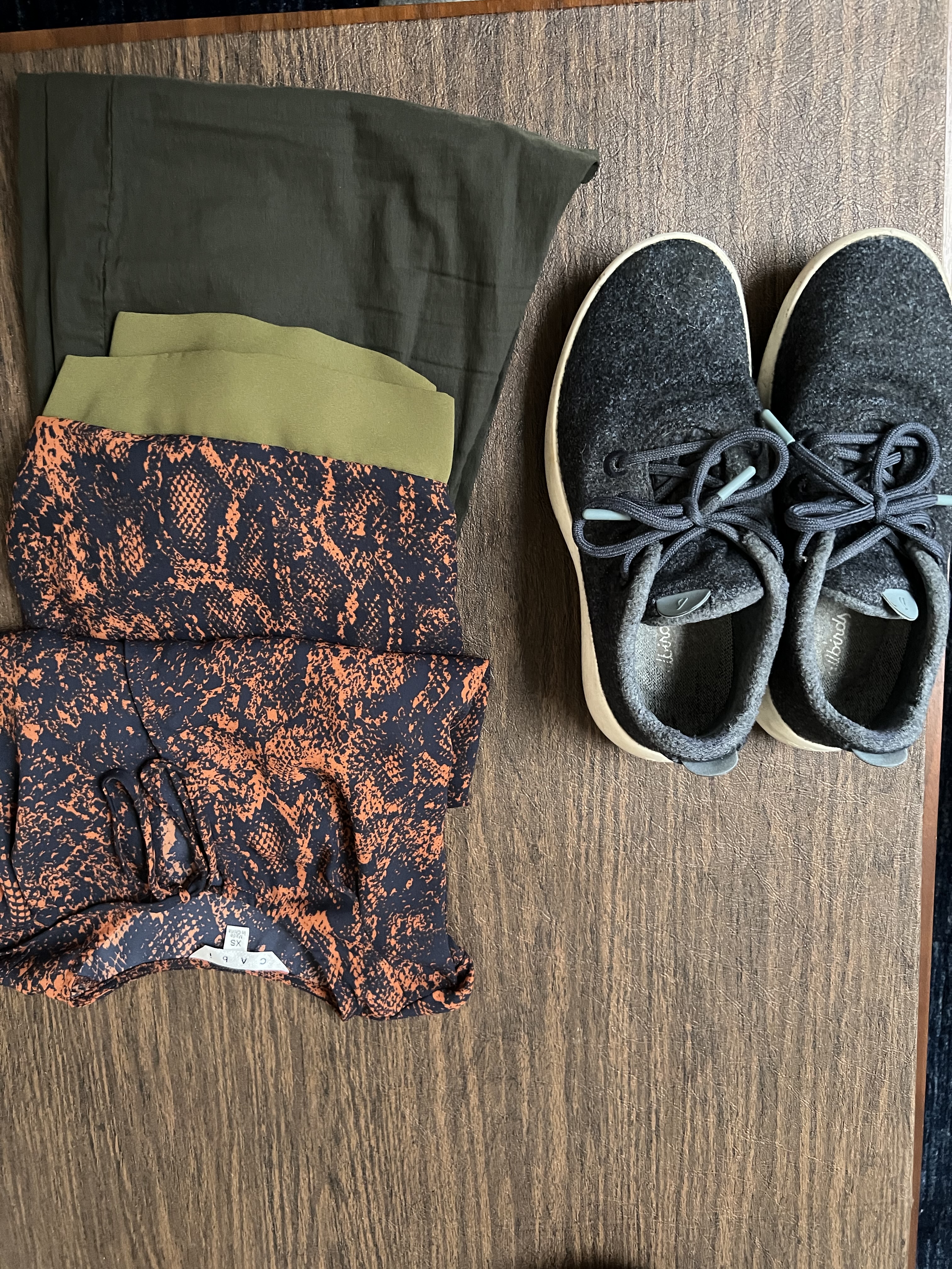 I added navy Allbirds because they are wool which makes them versatile (wool keeps you warm even when wet and are antimicrobial). They also take a load off of the orange sandals which as I said are doubling as my “fancy” shoes and are super comfortable walking shoes.